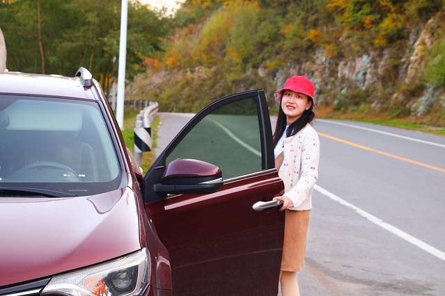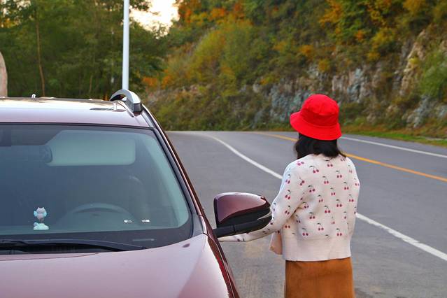 路边有一片空地可以用来停车,所以不必担心交通安全的问题,车的色调同秋天也是很搭配,小红车和我们也一起走南闯北,陪伴着我们,也见证了我俩的一次次旅行。