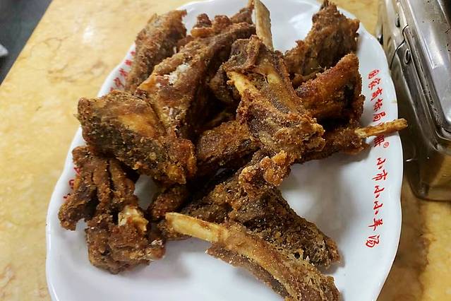 炸羊排又酥脆又香,羊杂汤喝上一碗真的很暖胃,尤其是第三天从关门山出来时,浑身湿透,又湿又冷,一喝上羊汤瞬间就不冷了,牛舌饼更是又香,又有嚼劲,小市羊汤还是值得品尝的。