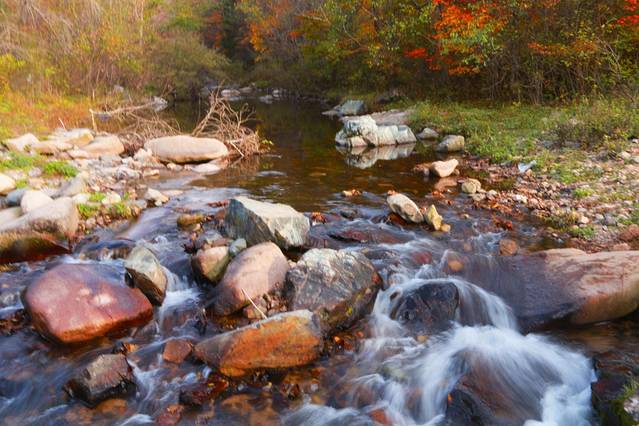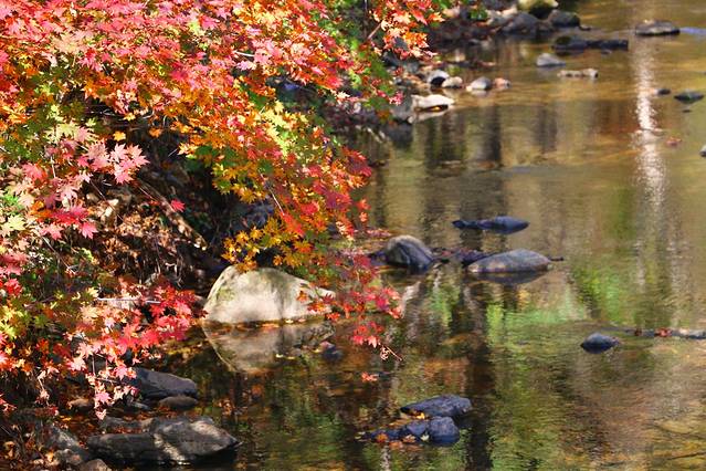岸边错落有致的枫树与时而激起的水花相得溢彩,美伦美奂,河流中有好多形状各异的奇石,斑驳的青苔附在上面,参差排列在河川之中,巍然不动的接受洗涤,变奏着刚柔相融的乐章,