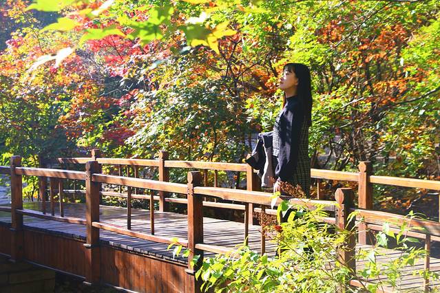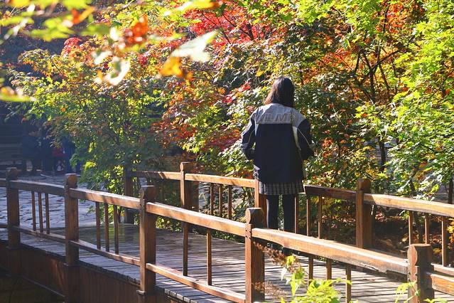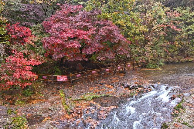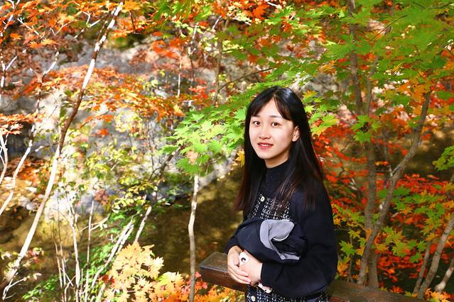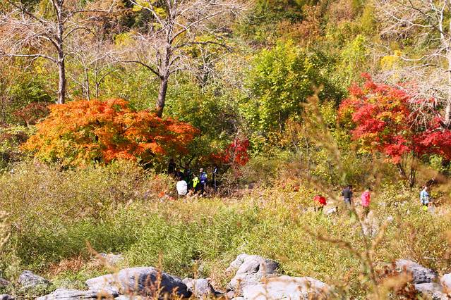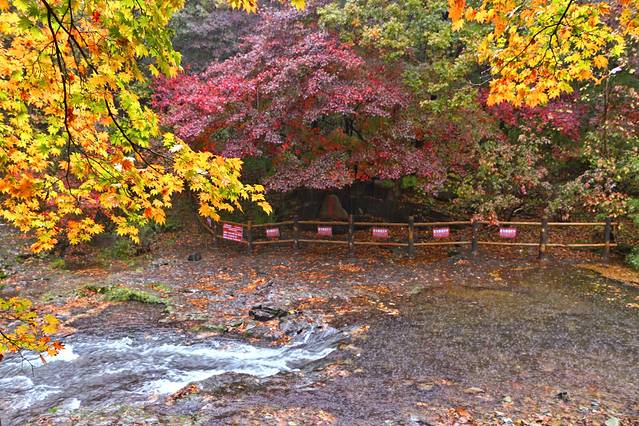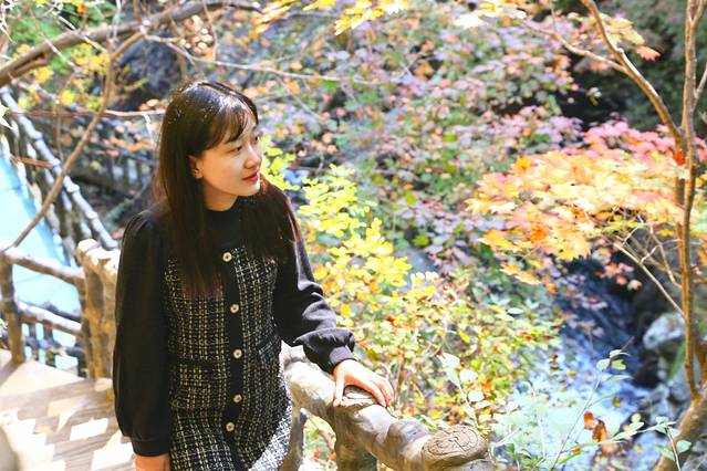 3、景点是免费开放的,枫后是在河的对面,要踩着石头走到对面,十一前后的枫后是渐变色,我也最得意这种枫叶的颜色。