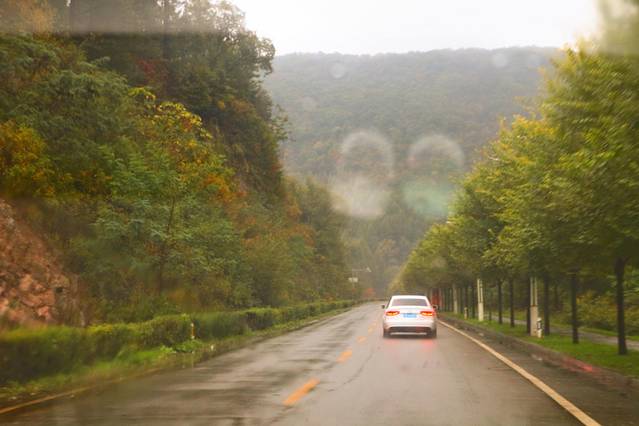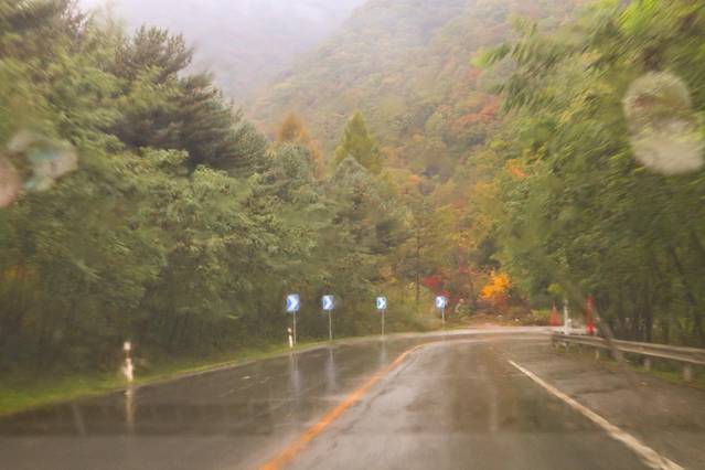 前往关门山的途中下起了大雨,行驶在山路上,风景有一种朦胧美,行车也要加的小心了,我们俩也一直犹豫要不要顶着大雨进关门山,经过一系列的心里斗争还是顶着大雨进去。进去之前我们买了雨衣,可能是想简单了,山里的雨越下越大,最后出来我俩基本湿透了。