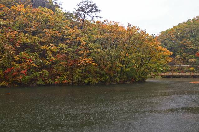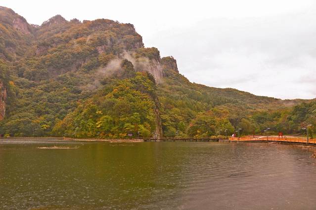 五彩湖靠近景区门口,上山下山都要经过这里,上山的时候拍的瑟瑟发抖的视频就是在这里,下山到这里的时候雨又变大了,整个山上一片水汽,湖面被雨水拍打的连连作响。