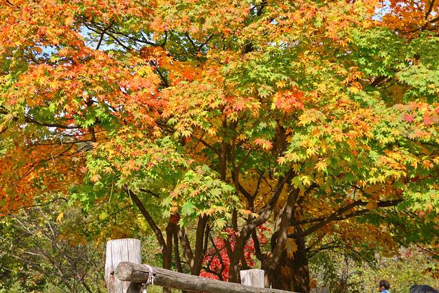 走到树下,枫后更加的震撼,树冠向四周延伸开来,一棵树呈现出不同颜色的枫叶,气质方面同其它的枫树有着与众不同的美感,好似披上了一件秋天的新衣。