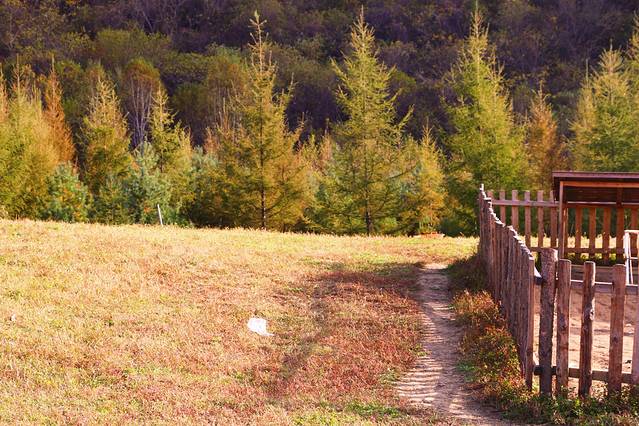 圈养牲畜的栅栏,错落有致地散布在山坡之上,小动物在这里安宁而祥和的生活着,不慌不张,不匆不忙,远望山林,天高云淡,层林尽染,整个氛围有着诗意般的宁静而隔世。