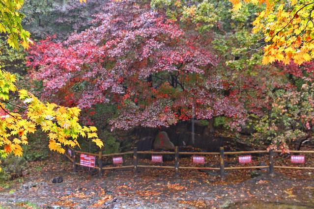 沿着山路向上,山峰奇峭、怪石林立,宛若天造地设的巨型盆景,大面积的枫树遮掩山体,涂满奇峰,浪漫而热情。