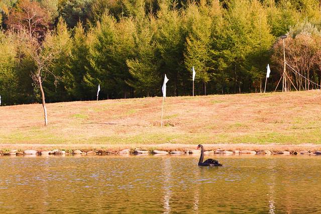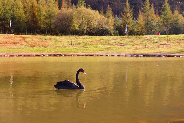 不大的池塘被阳光照的波光粼粼,黑天鹅时而游上岸晒太阳,时而游进水里觅食嬉戏,它们也享受着这绚丽的秋色。