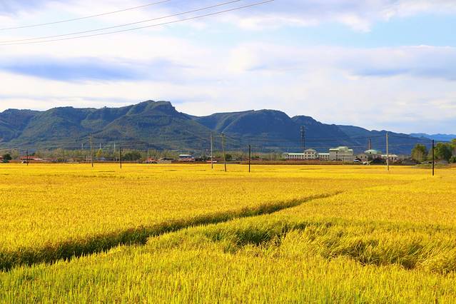 本桓公路途经碱厂镇,整个镇上种满了水稻,公路到了这里犹如从稻田里延伸出一样来,进入秋天,水稻变成金黄黄的一片,微风吹过,稻浪翻滚,与远处的青山,与劳作的辛勤身影,构成了一幅大自然的“五线谱”。