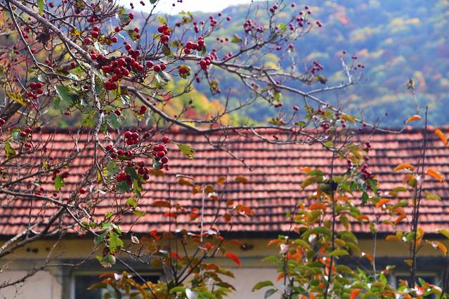 村庄门前的山楂树也诉说着秋天的到来,树梢结满了红彤彤的山楂,站在树下,好似一曲山楂树之恋。