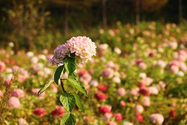 花海中间有条路,可以蜿蜒的走到山林下,漫步在花海里,能够闻到属于秋天的芬芳。