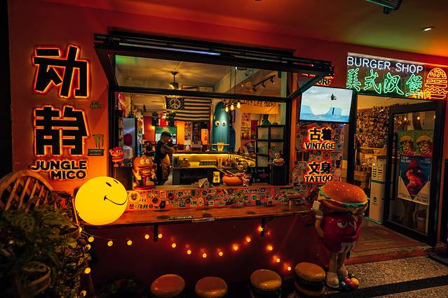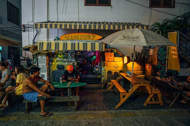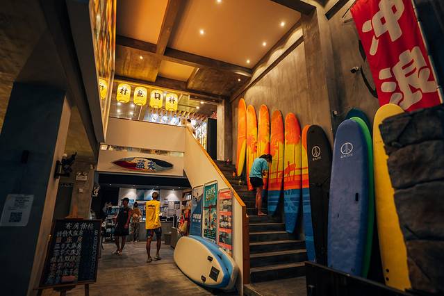 踏进后海村就感觉回到了我的快乐老家,沙滩上满是冲浪的人,这里是最适合初学者学习冲浪的港湾。五颜六色的冲浪板形成了独特的风景,还各种工艺品店铺集市,人们惬意地品尝着美味,吹着海风闲聊。