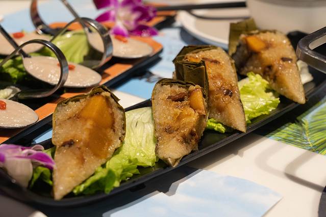 1)海南蛋黄黑猪肉粽:相当饱满,味道也很到位,猪肉肥而不腻非常的紧实!是非常好吃的一道前菜,糯米香糯搭配咸蛋黄很好吃,一定要趁热吃!