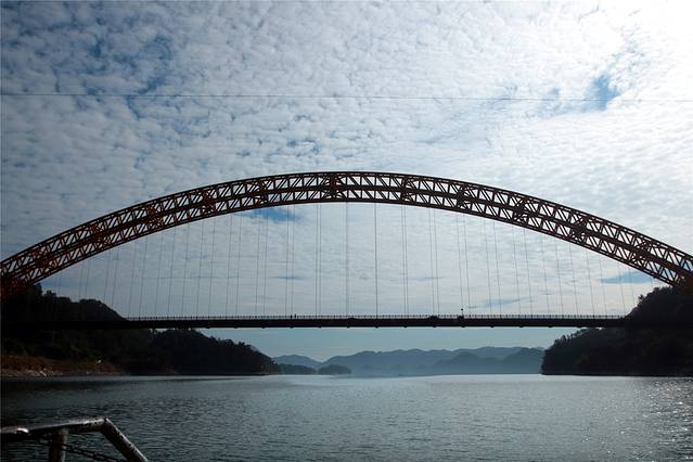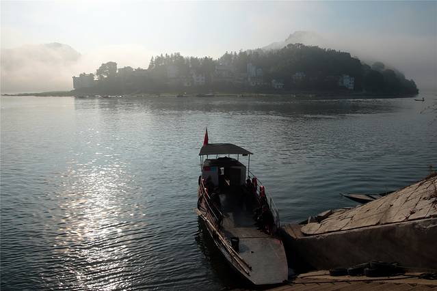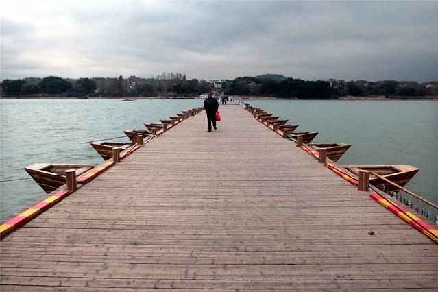 浮桥长约400米,由100多只小舟板并束之以缆绳相联而成,始建于宋乾道年间(1163--1173)、至今已有800多年历史。