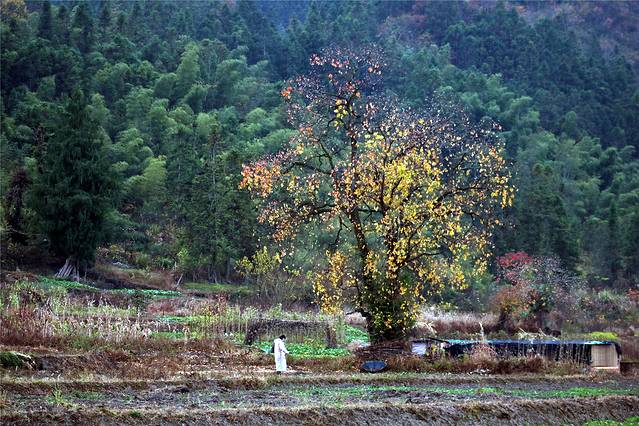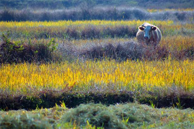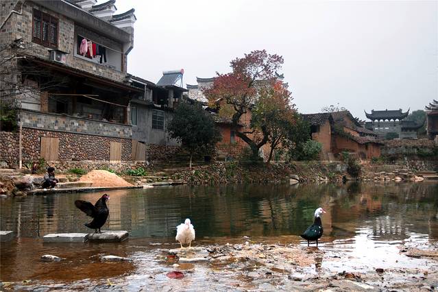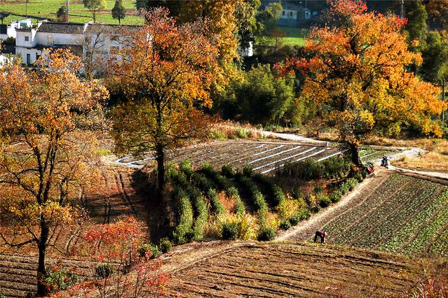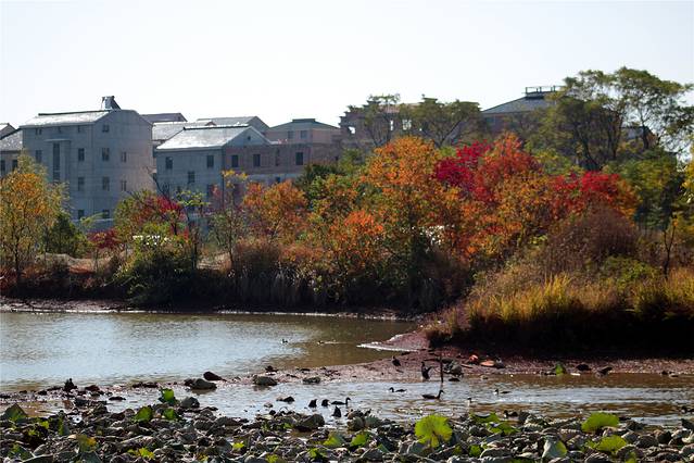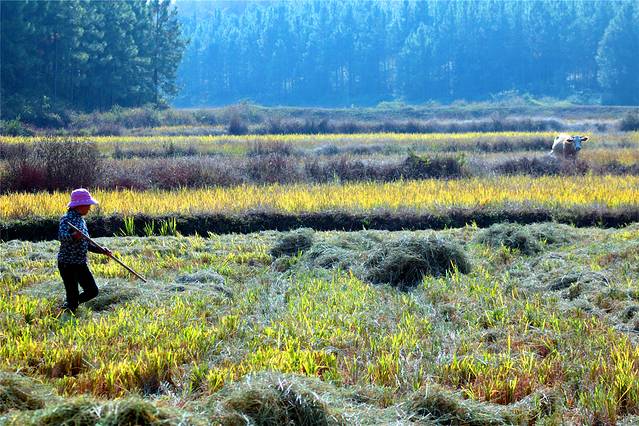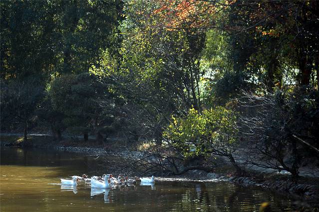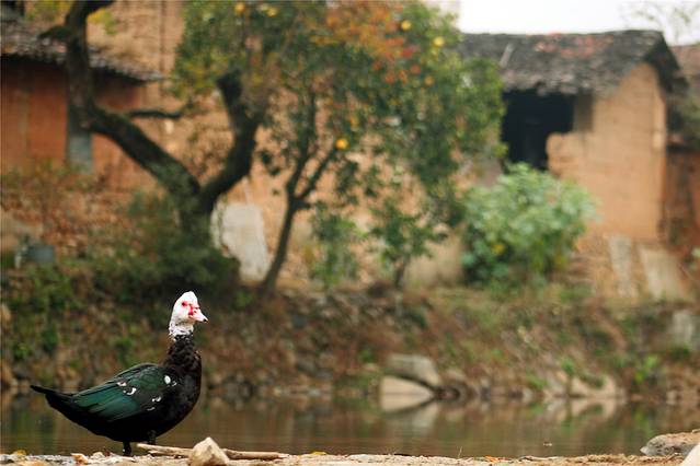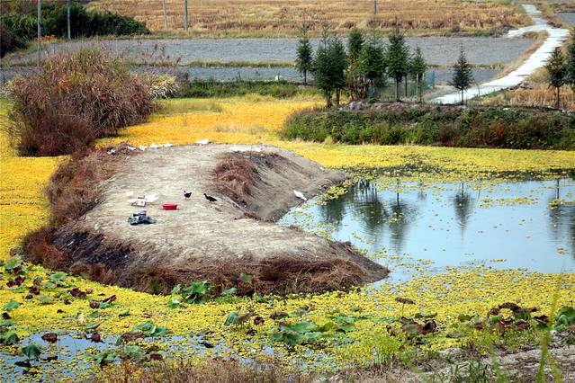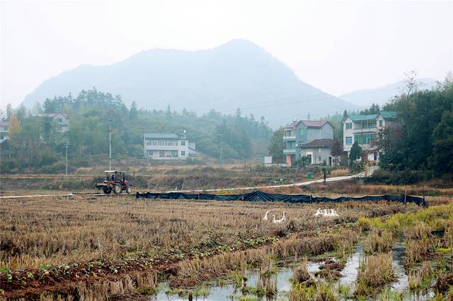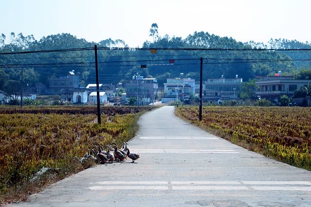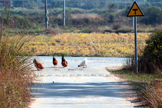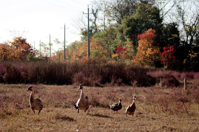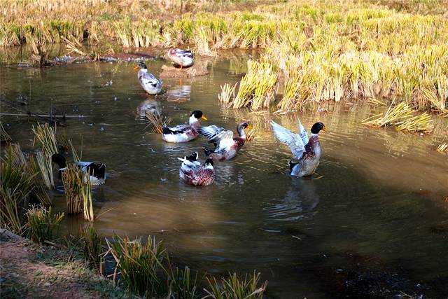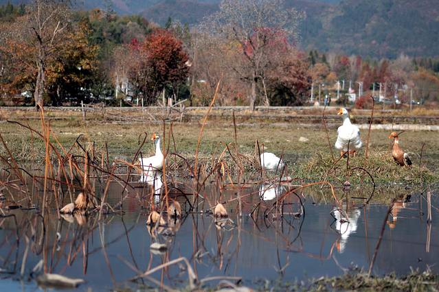 秋天的色彩很丰富,但田间禾稻已收割一空,只有些鸭子在找漏网的谷物或田螺等填肚。