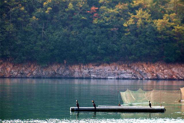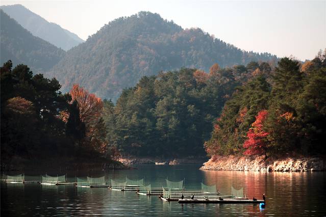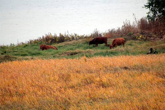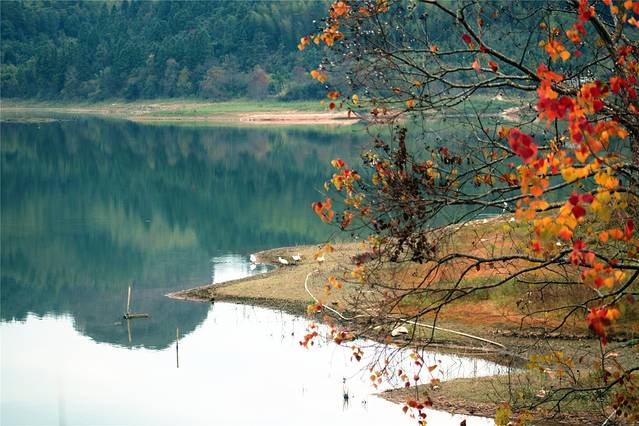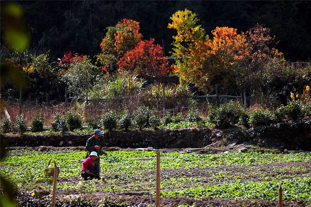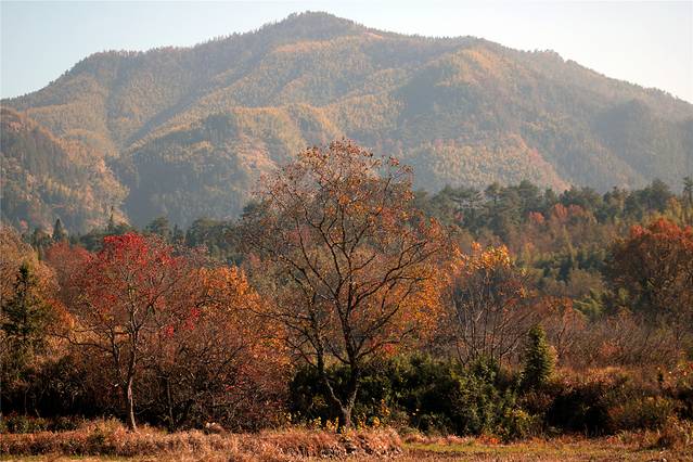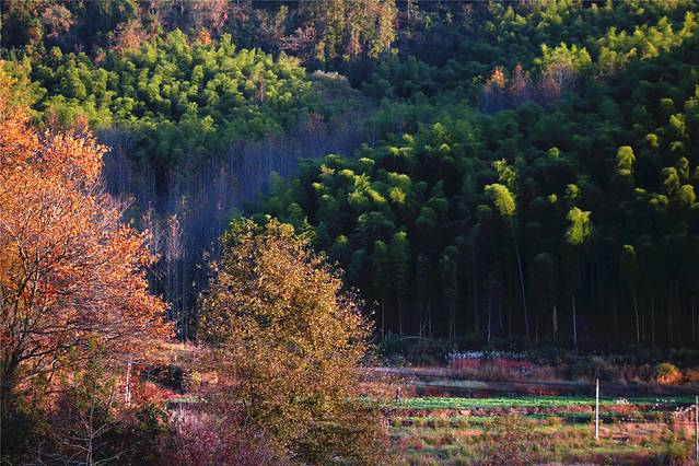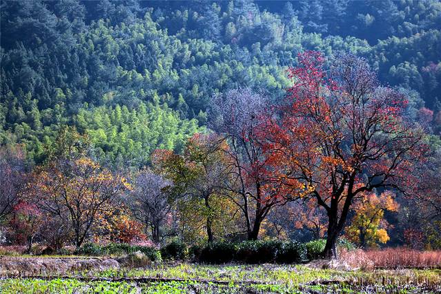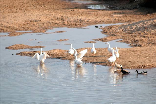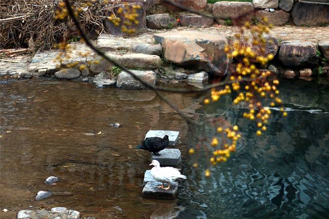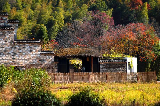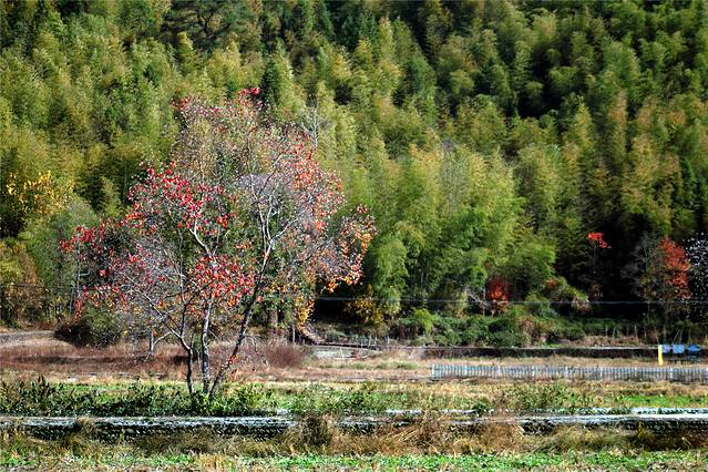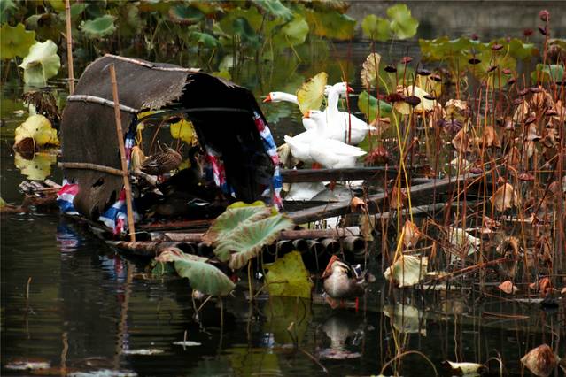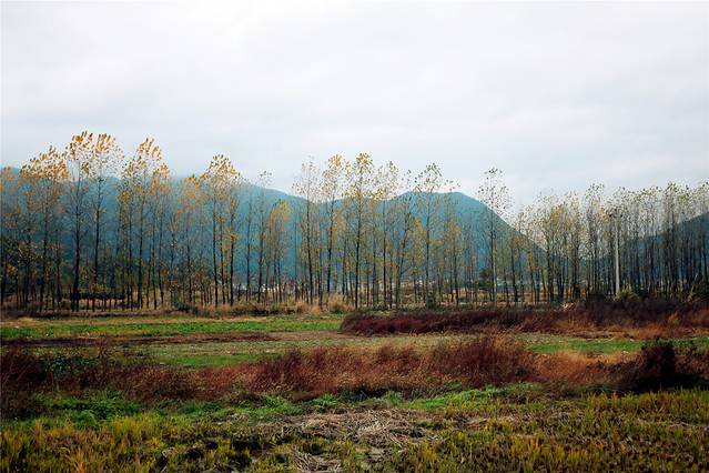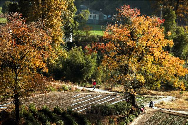 秋天的色彩很丰富,但田间禾稻已收割一空,只有些鸭子在找漏网的谷物或田螺等填肚。
