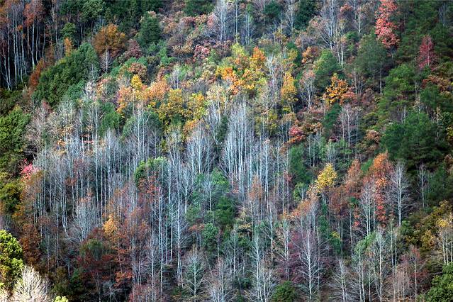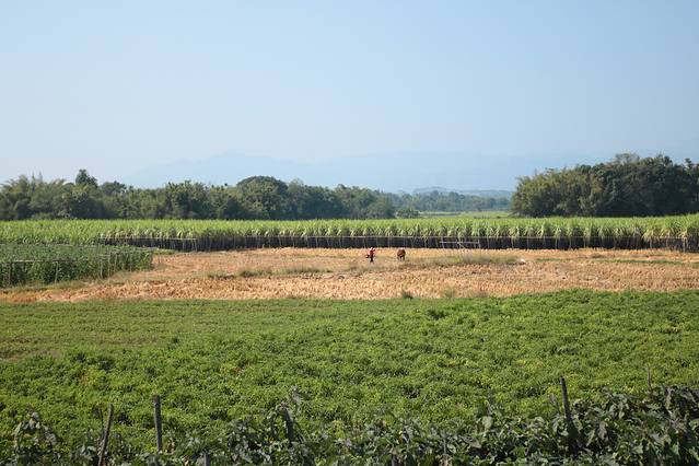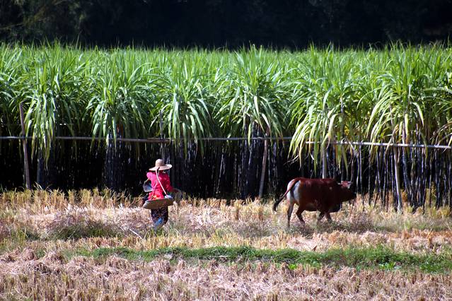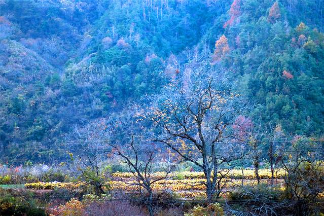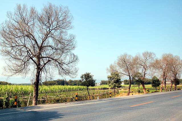 退冬的树,叶子已掉光,只剩枝桠,好在远处田间还有绿植,那是甘蔗,待收割之中。