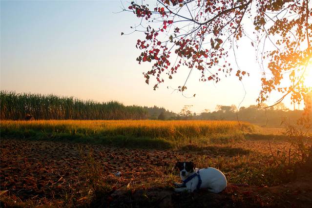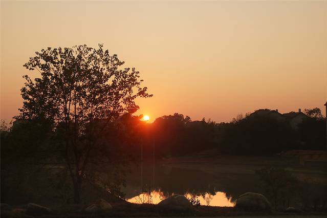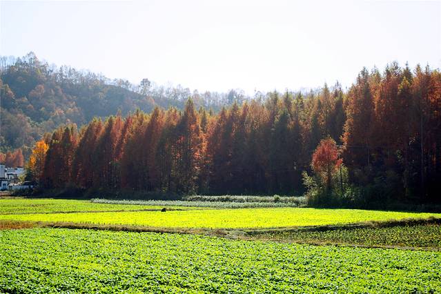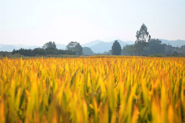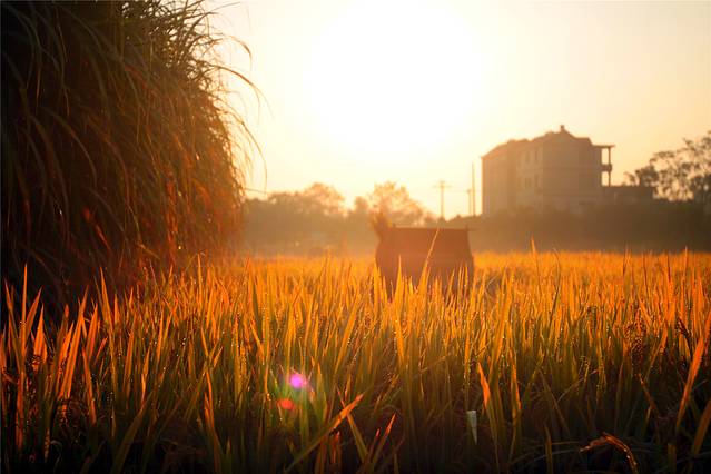 深秋的阳光慢慢升起,给树木草坪禾稻镀上一层暖暖的金黄。