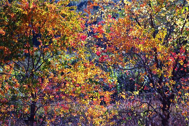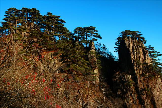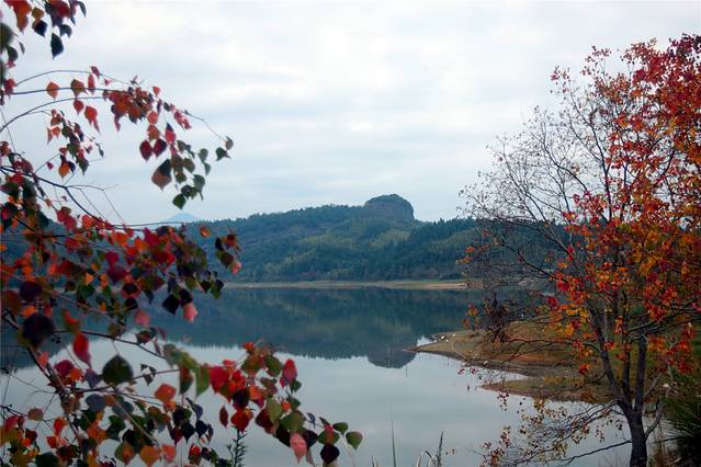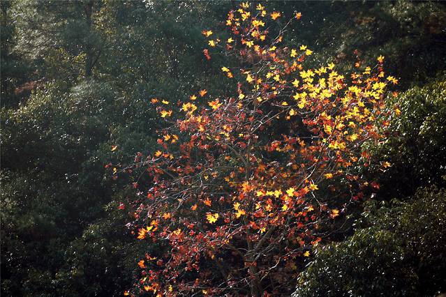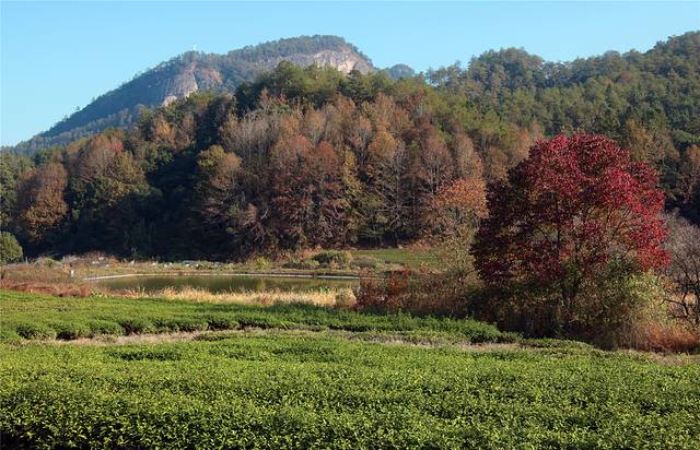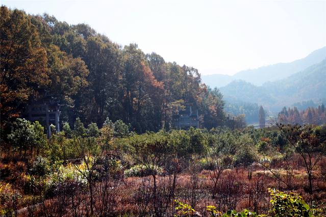 前院一片草坪,对着的小岗上树木开始转红了。