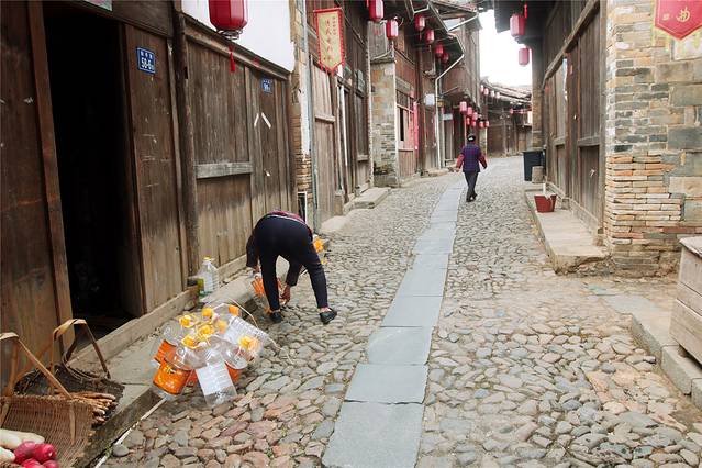 街道两侧纵横交错的大小巷道都是中间铺青石板,两边铺河卵石,