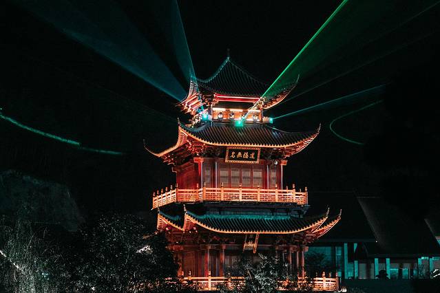 碧波环绕的众妙阁,是葛仙村的标志性建筑,也是景区的制高点,主楼高26米,三层四柱的古建筑纯木结构,灯光表演先从“亮阁”开始,流光溢彩的科技灯光聚焦投影在众妙阁上。
