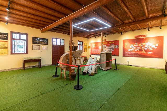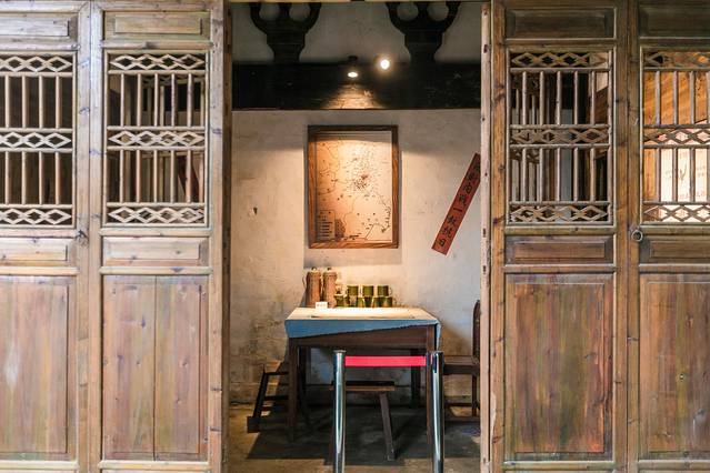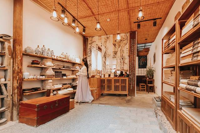 青石板路上留下的车辙印,述说着小镇当年的繁荣,街口的艺首纸艺馆是一座造型独特的老房子,里面展示着连四纸等非遗文化的文创产品,也是一座歇脚休憩的茶室。