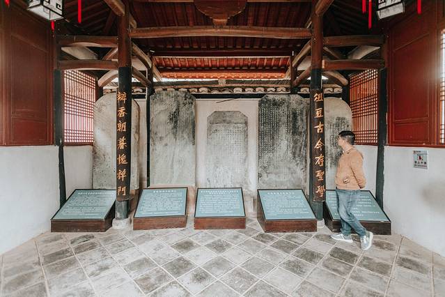 书院古色古香,江南风韵的建筑群,四周山水相伴,建筑错落有致,牌坊御碑、玉栏月池,是一个非常适合汉服打卡的地方。