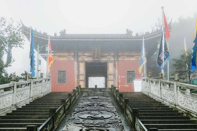 如今通过全长2069米葛仙山索道,仅需10分钟就可以达到接官亭,缆车从山林顶端略过,雨中的葛仙山云雾缭绕,林木若隐若现,沿着接官亭前的台阶一路攀登,到达葛仙山的最高峰,香炉峰上建有葛仙祠。