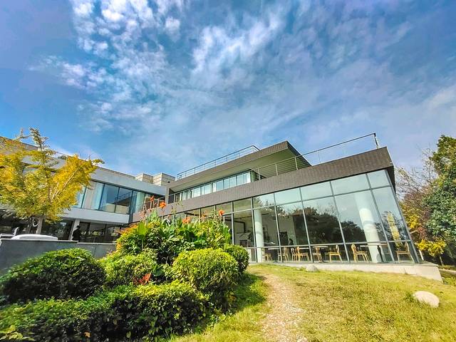 推开民宿的大门,只见整个民宿有一个超大规模的大草坪,而民宿的建筑主体为三层,面积770平方米,以艺术和自然气息相结合,很NICE!