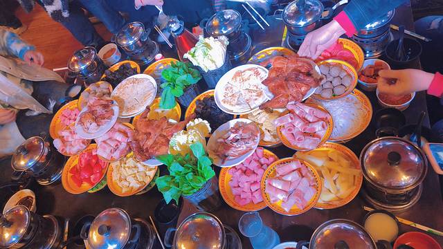 民宿客服推荐,一家云南特色菜馆,中间是石锅炖汤(可涮火锅),外面一圈是烤肉盘,用的是炭火。汤很好喝,极力推荐。牛肉和五花肉也很不错,只是如果能提供人工帮烤就好了,我都烤焦了🤦♀️