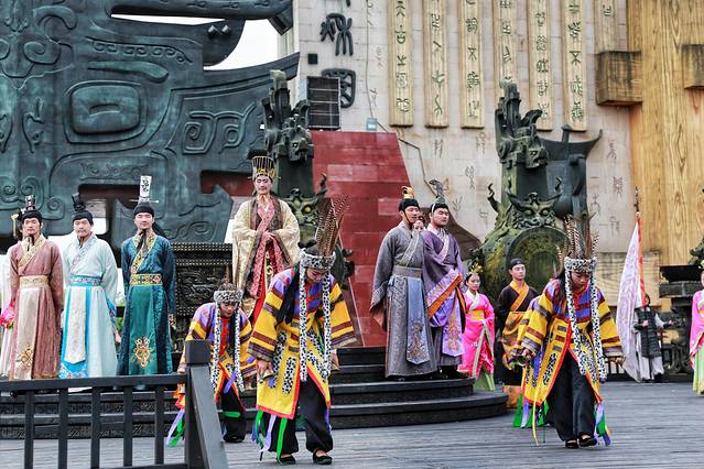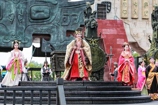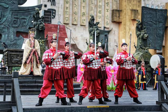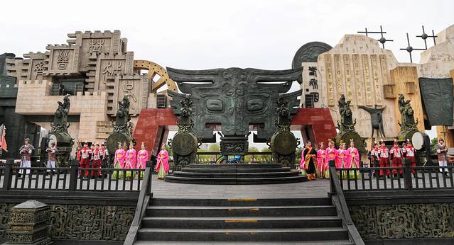 入园正门之后即是青铜大门广场,《祈福大典》准时上映,再现了2500年前春秋时期淹国的祈福仪式。士兵与宫女已经就位,观众也在现场工作人员的组织下,让出通道 ,等待淹王登场。