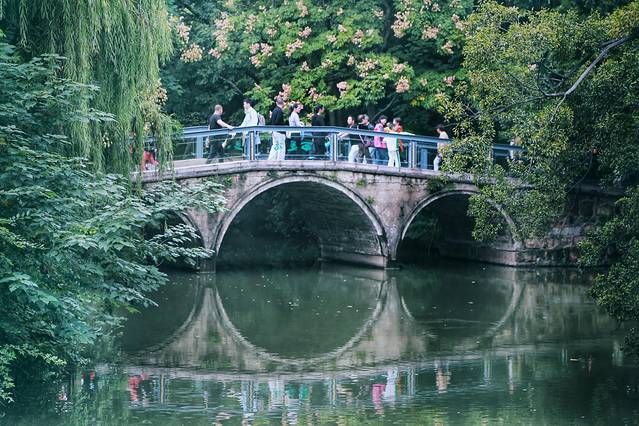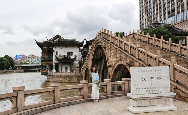 文亨桥始建于明代嘉靖二十七年(公元1548年)。三个孤拱形桥洞与水面形成三个大圆环。每当秋夜时分,明月倒映,三个洞环中均能看到,景色迷人,这就是闻名遐迩的"文亨穿月"之景。老公在这里拍了很久。