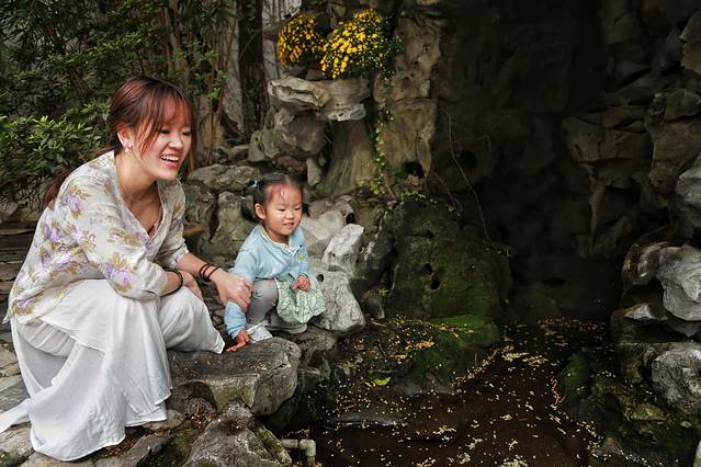 我们惊叹于这一处小景的时候,暖暖开始玩水。我这才发现原来头顶还有一棵桂树,洒落一地一池金桂。