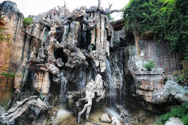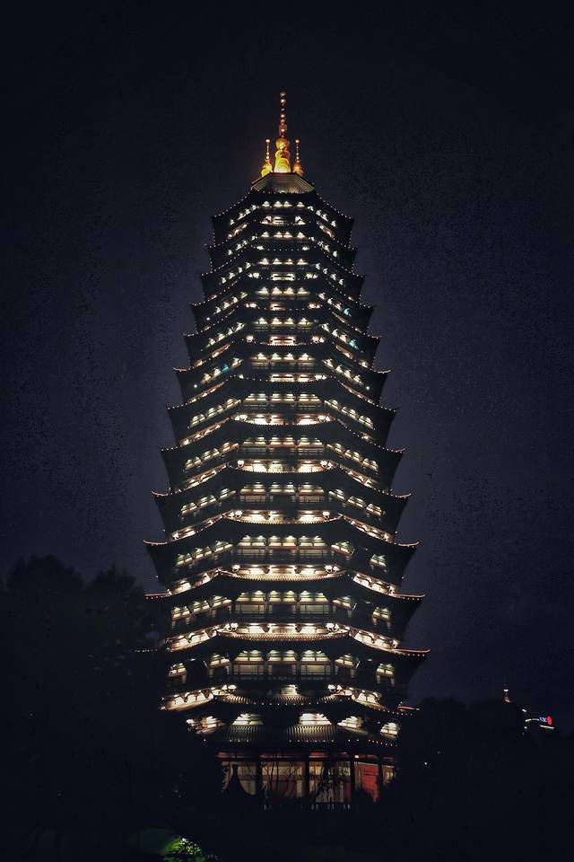【大殿后面的天宁宝塔高153.79米,为世界第一高佛塔。从底层地宫到顶层钟楼,整座宝塔以佛教文化为主线,以 东阳 木雕、 扬州 漆器、 常州 乱针绣、 惠安 石雕等手工艺术为表现手法,巧妙地诠释了大乘佛教的诸多教义。佛塔的建成,与北方云岗大佛、中原 龙门 大佛、西方 乐山 大佛、东方灵山大佛、南方 香港 天坛大佛遥相呼应,成为五方五佛的佛心。】