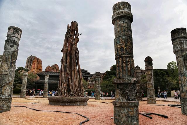 青铜大门广场旁边就是巨大的春秋版图广场,很鲜明的标志了当时各国版图,版图上还立有当时最有名的十二家(如法家、儒家等)图腾柱群,一股历史的肃穆氛围扑面而来。