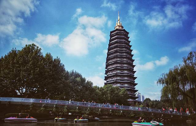 走上一段木栈桥,惊喜的发现我们竟然走到了天宁塔的脚下。老公特别开心,虽然没有拿脚架,但还是努力的拍下它的美。
