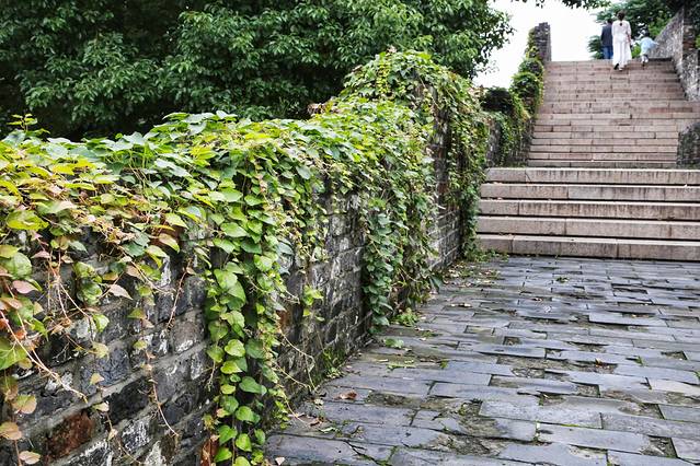 不让进,没办法,我们就沿着外墙走吧,看看有没有别的路。走了一阵,发现右手边一座小桥,粑粑先行探路,过了很久他才回来,说里面有很远,不知道通向哪里,可是看起来很美,问我们要不要去。当然~