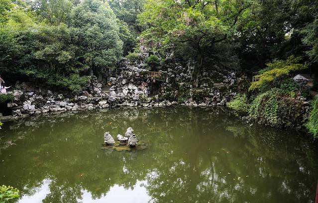 公园里面的水域仅此一处,也是被绿色环绕,一圈湖石,玲珑通透。