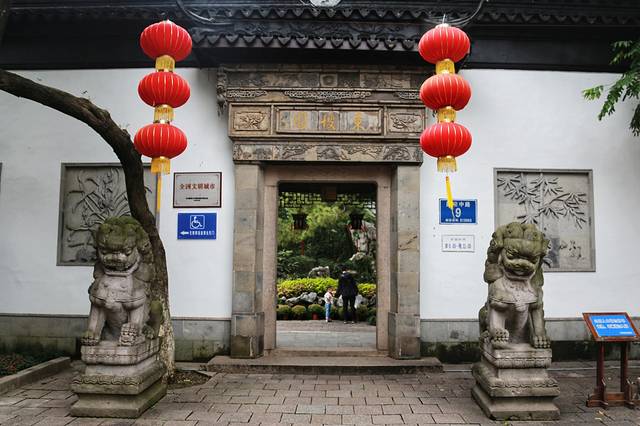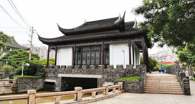 中式园林顶顶讲究山(石)水的比例,诺大的公园里,水就只有这么一点,乍看之下似乎是不合比例。实际上独具匠心的造园者巧妙地将园外古运河的水“借”进园内,充分体现了园林艺术中的“借景”手法。整个公园由一个三面环水的半岛和古运河中的半月岛组成,运河之水也成为公园景致的一部分。
