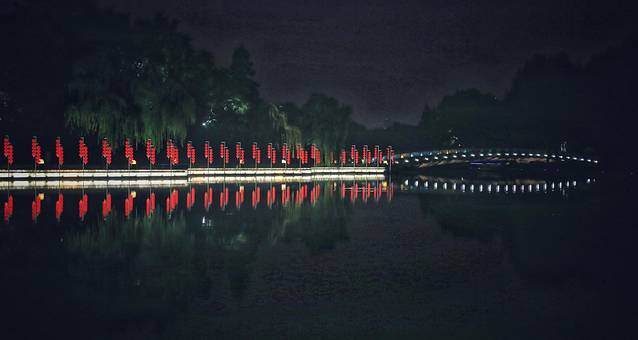 继续往前,就看到了开阔的水面和漂亮的灯火,原来我们又走进了红梅公园。