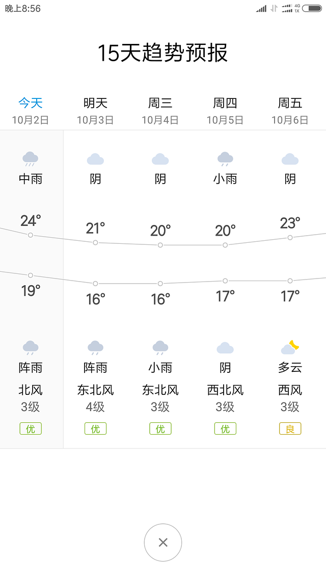 再就是带宝宝出门,要根据天气温度给她准备衣服啊,还有亲子装的搭配,都是既需要考虑游玩路线,又需要考虑天气的。所以下面赠送一张10月2日截图的常州十一期间天气。