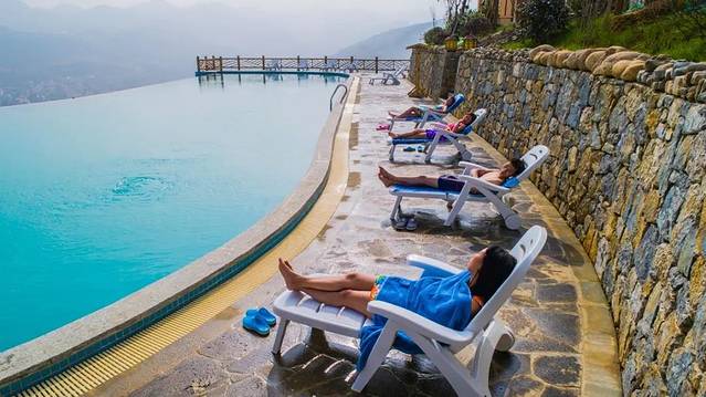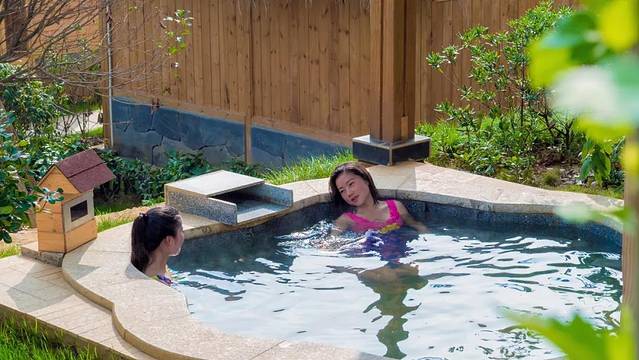 汤池是环形结构,沿山势倾角阶梯式铺展,隐居深山的周边环境,负氧离子远超城市数千倍!边泡汤边清肺!