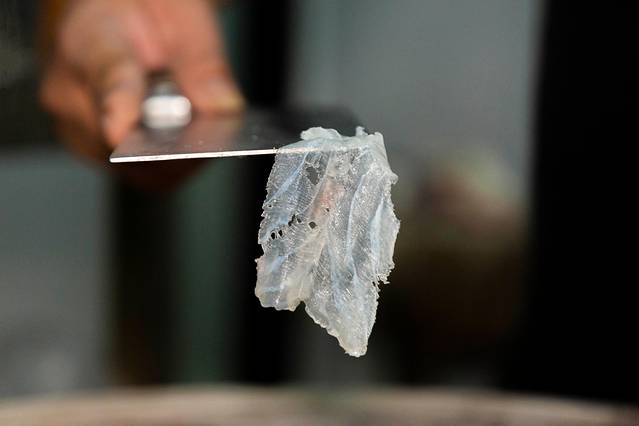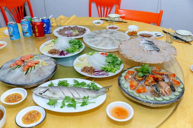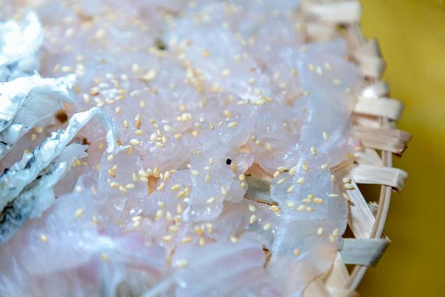还有 饶平 港的野生沙鲈虾,以它作虾生,其Q弹程度令人赞叹不已,好吃到“怀疑人生”!值得一提的是 潮州 的虾生不是对半分的,而是像鱼生一样片成透光的薄片,刀功更是彰显了师傅的娴熟,做街坊生意的他,一到宵夜时段就忙到七彩,虾生已是食客点击率最高的刺身之一。