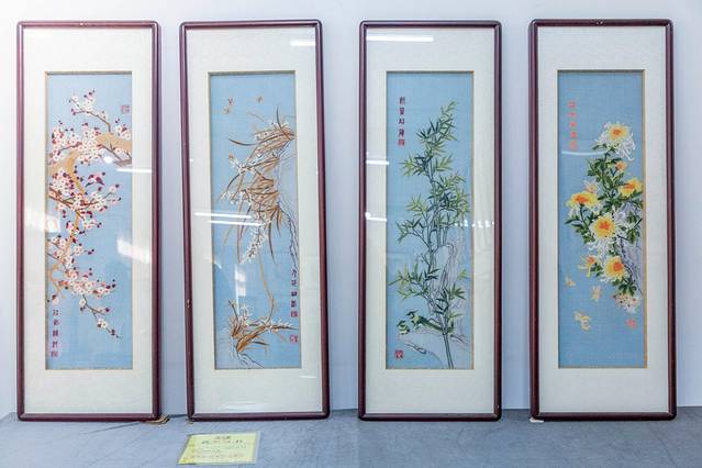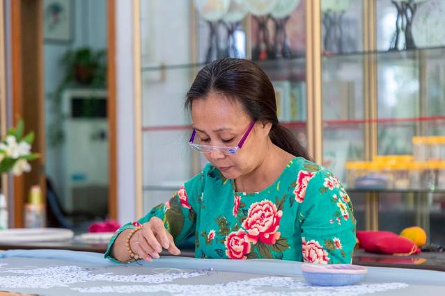 潮绣还有一个难点就是抽丝,绣好的布上面将图案以外的部分按照经纬线抽取掉,也不是那么容易就可以完成的。