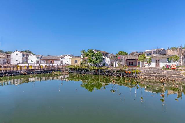 走进村里首先映入眼帘的是一个硕大的荷花塘,此时已不是荷花的季节,只能看到一些荷花残缺不全的身姿还在荷塘当中,不过蓝天下的荷塘倒影着老屋的身影显得格外的宁静。