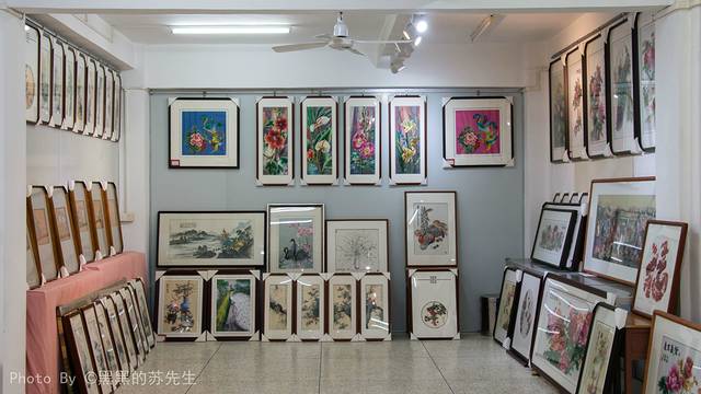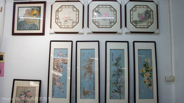 潮州刺绣文化研学基地分为上下两层,一楼主要是郭春珍工作和研学活动的地方,如果想欣赏郭老师的佳品,那一定要到二楼走走。来到二楼你一定会“眼花缭乱”,因为这里收藏了很多代表潮州潮绣最高水准的作品。《梅兰竹菊》是它最具代表性的作品之一,它在2017中国(广东)民间工艺博览会上获得了金奖。