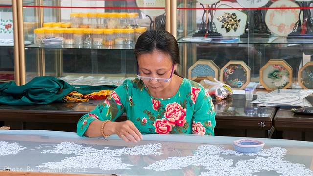 潮绣讲究构图均称,其品种大致可分为日用品、欣赏品和剧服三种,形式有绒绣、纱绣、金银线绣、珠绣四大类。不过现在的潮州也开始注入了新的想法,有动物,有人物,这些新的元素让潮绣有了更丰富的画面。