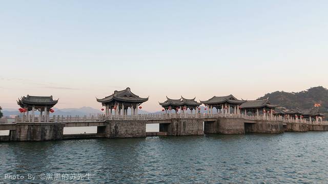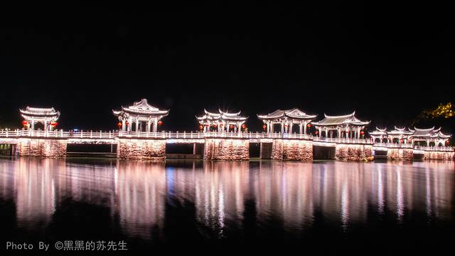 广济桥历史上有过很多次维修,2003年的维修把桥屋改成桥亭,桥亭独立而通透,有利排水通风。夜幕渐渐降了下来,来来往往的游客停下了脚步欣赏它独特的美。这就是潮州的夜,这也是广济桥的夜。