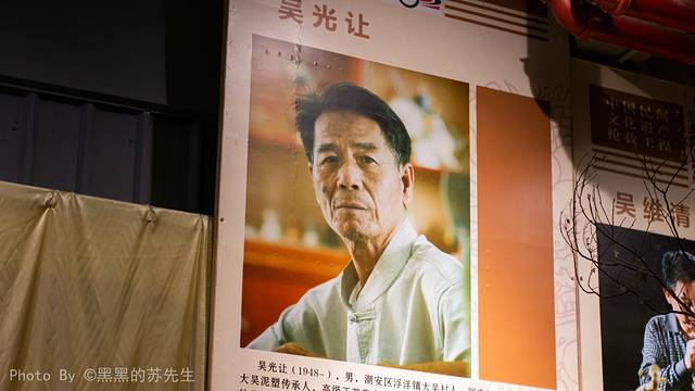 吴光让先生是大吴泥塑的第23代传人,听馆内的工作人员介绍,他在16岁时便着父亲学习雕塑和贴塑,有从事泥塑30多年的丰富经验。他的泥塑作品曾获第一届中国民间工艺美术“乡土奖”金奖、中国传统工艺美术精品大展金奖,多件贴塑作品分别被中国美术馆、中国农业博物馆、广东省博物馆、广东美术馆等收藏,被授予“广东省工艺美术大师”称号。