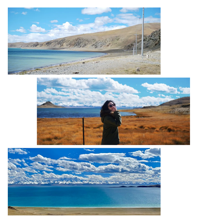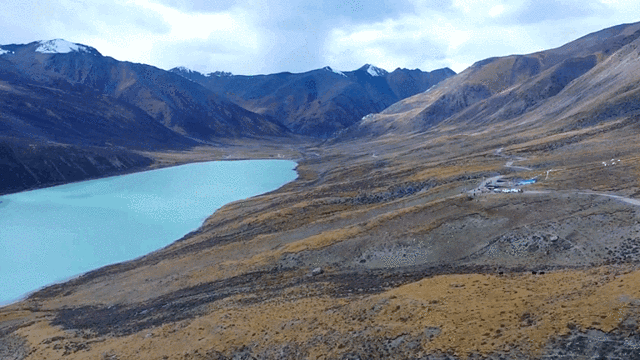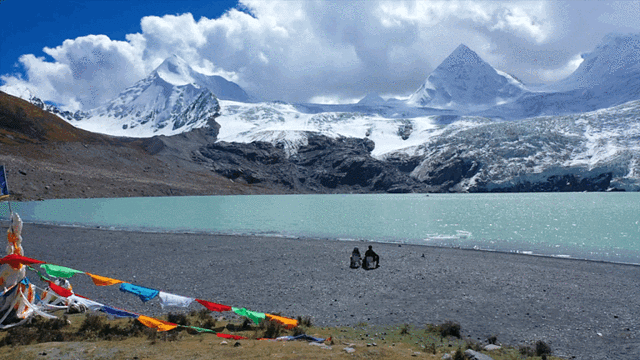山下圣湖分为内湖和外湖,都是雪山融水,近看似乳浊液(大概是含盐量较高有微微泛白),远看则像一块戴在萨普白衣上的翡翠。