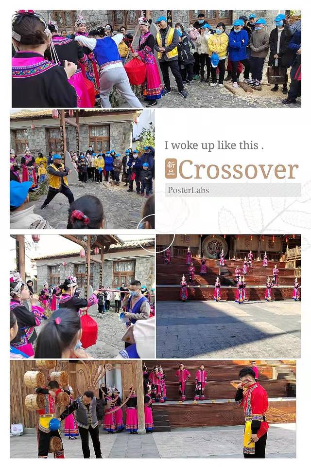 被一阵喧闹声音吸引,古樟前的戏台子前聚满了人,皆是一群头戴小蓝帽的游客,戏台之前锣鼓喧天,在一阵热闹之后,别开生面的畲族特色的表演开始了。先是一个小哥上来了一阵杂耍,“高空抛物”,我也不知道这个小哥是怎么做到抛出装满水的容器还能这么游刃有余的把玩,最奇特的是,滴水未落。在我还回味在这个表演之中,下一个表演更让我为之一颤。一个架子上有六个木桩,人置于中间,另一个人朝着木桩上扔斧头,我着实为那个站在中间当靶子的小哥捏了把汗,小哥死死的用安全帽护住自己的重要部位,在扔最后一个斧头的时候,当靶心的小哥吓了一跳,躲了一下,还好斧头完美的落在木桩之上。