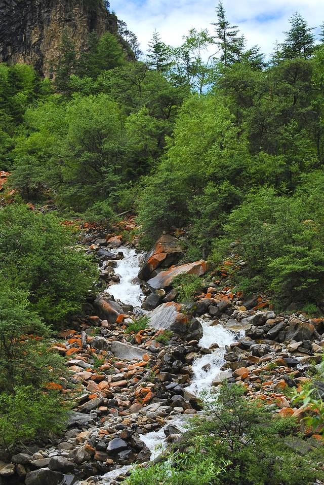 开始徒步向下游,先看到静心池和瑶池,瑶池的水是清澈的墨绿色。沿着杜鹃走廊的台阶向下,旁边是湍急的山涧,两边是盛开着杜鹃花,北方都是矮小的株棵,而这里是好高大的杜鹃树,有些花枝几乎伸展到水里,一路走下来好美!栈道、小桥、凉亭,路很好走。